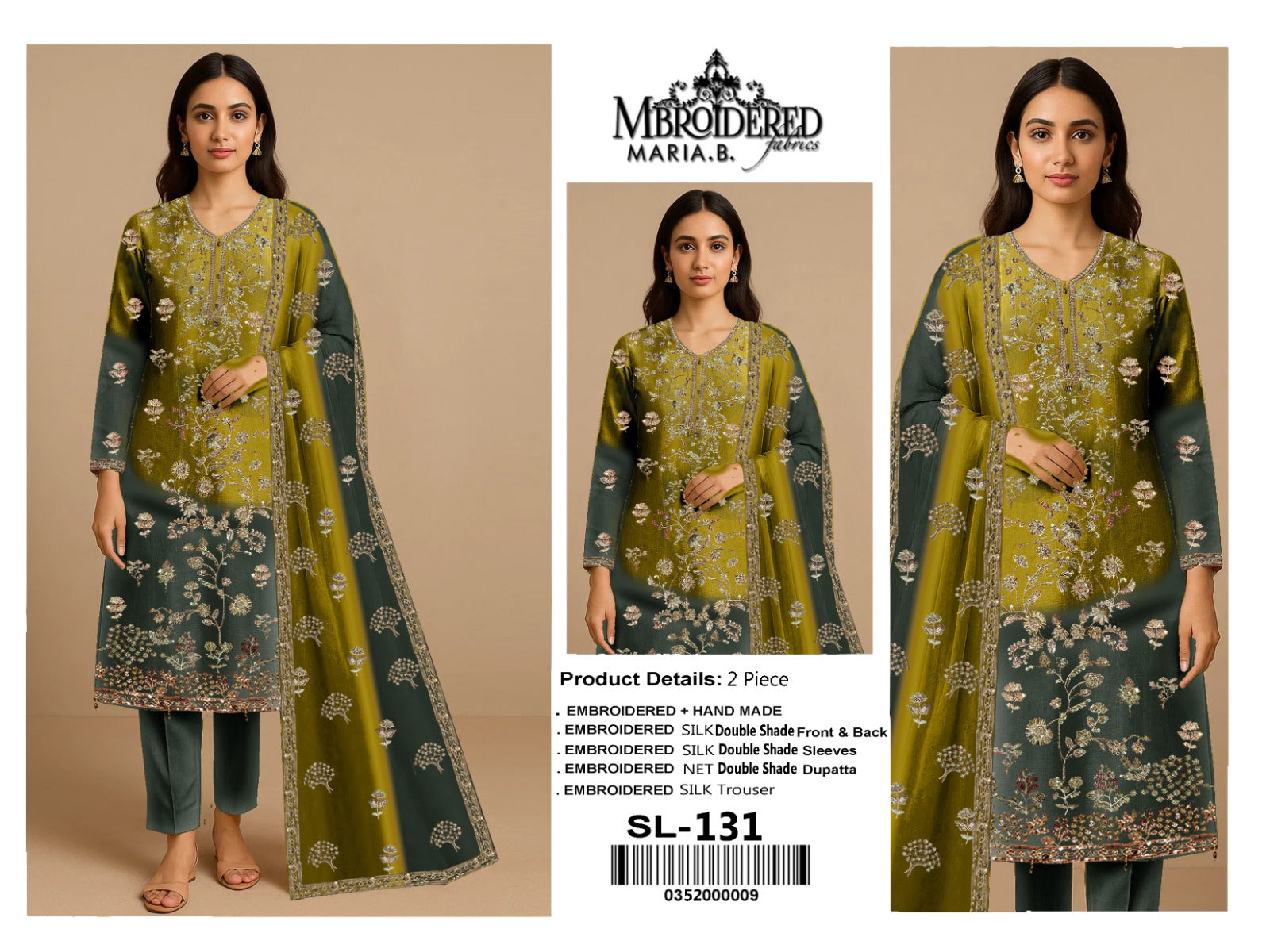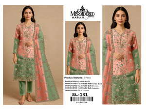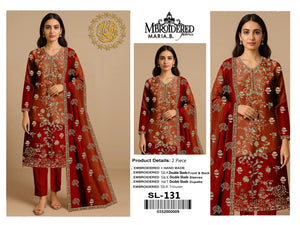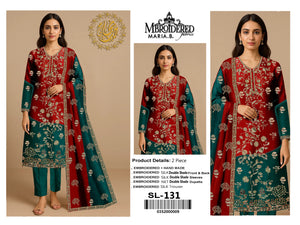 Add a touch of timeless elegance to your wardrobe with this exquisitely designed embroidered silk double shade 2-piece suit by Maria B. Featuring a striking combination of deep red and rich teal, this outfit is a perfect blend of traditional craftsmanship and contemporary style.